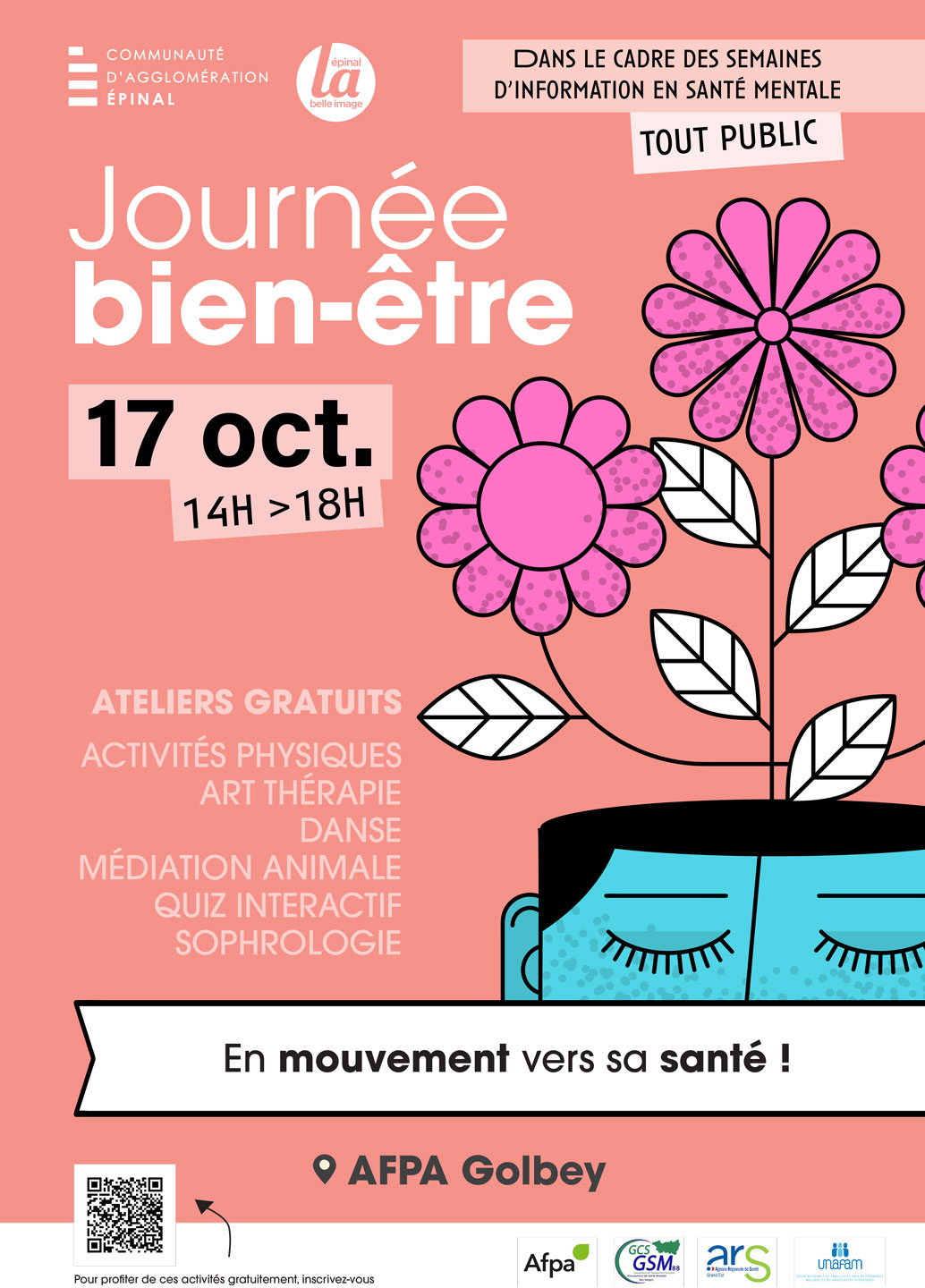 Dans le cadre du Contrat Local de Santé de la Communauté d’Agglomération d’Épinal, et à l’occasion des Semaines d’Information en Santé Mentale, l'AFPA organise une journée « bien-être et mouvement ».